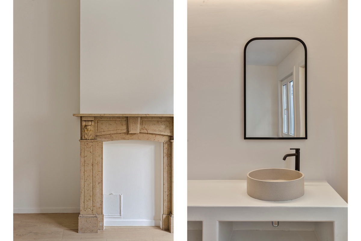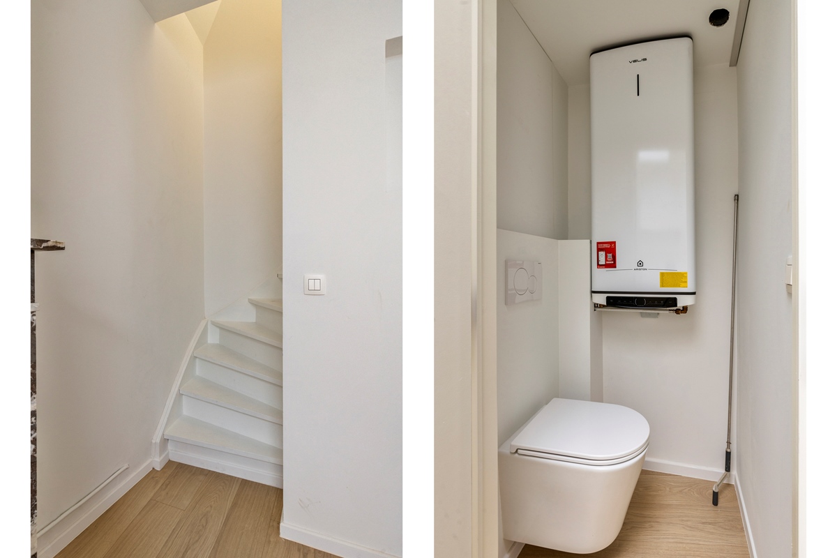 - 1ste VERD.: volledig nieuw ingerichte badkamer (inloopdouche en lavabomeubel), 1 ruime slaapkamer (die, in geval de ruimte beneden als eetplaats wordt gebruikt, perfect kan dienen als woonkamer/zitplaats).