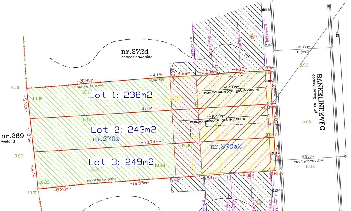De 3 loten hebben een grondoppervlakte van 238m², 243m² en 249m². Telkens op het gelijkvloers bedraagt de maximum bouwdiepte 16,50m en op het eerste verdiep 12m. De woningen hebben dan telkens een voorgevel van ca 5,80m.