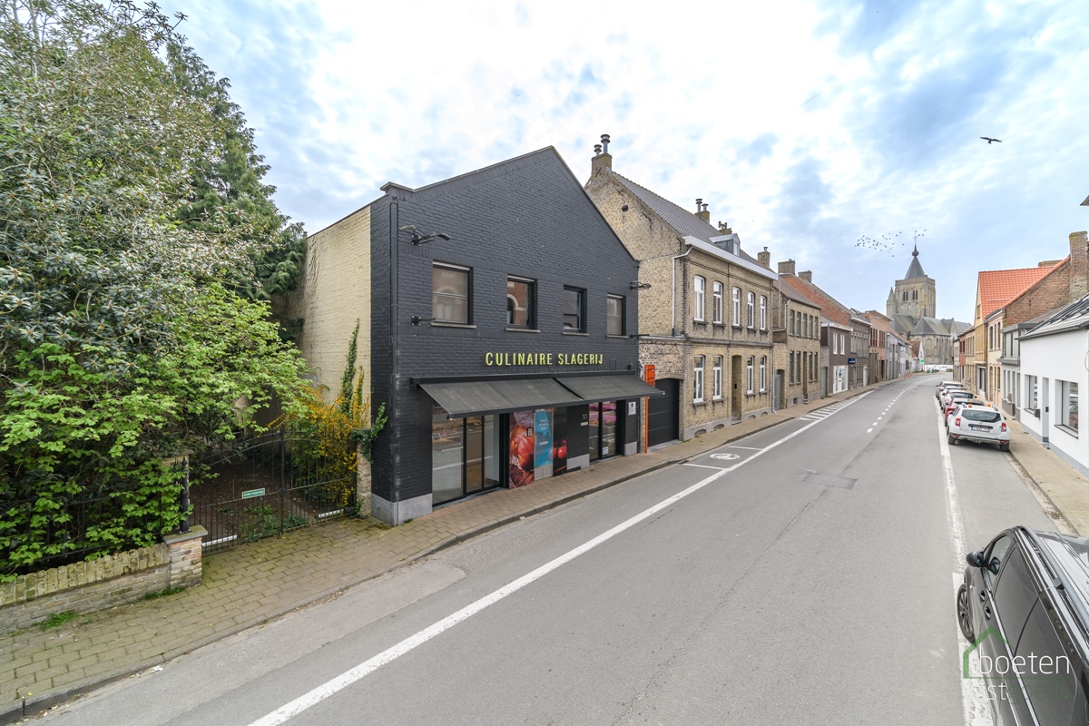 Alveringem: handelsgelijkvloers, momenteel ingericht als beenhouwerij, met tuintje en car-ports in het hart van Alveringem.