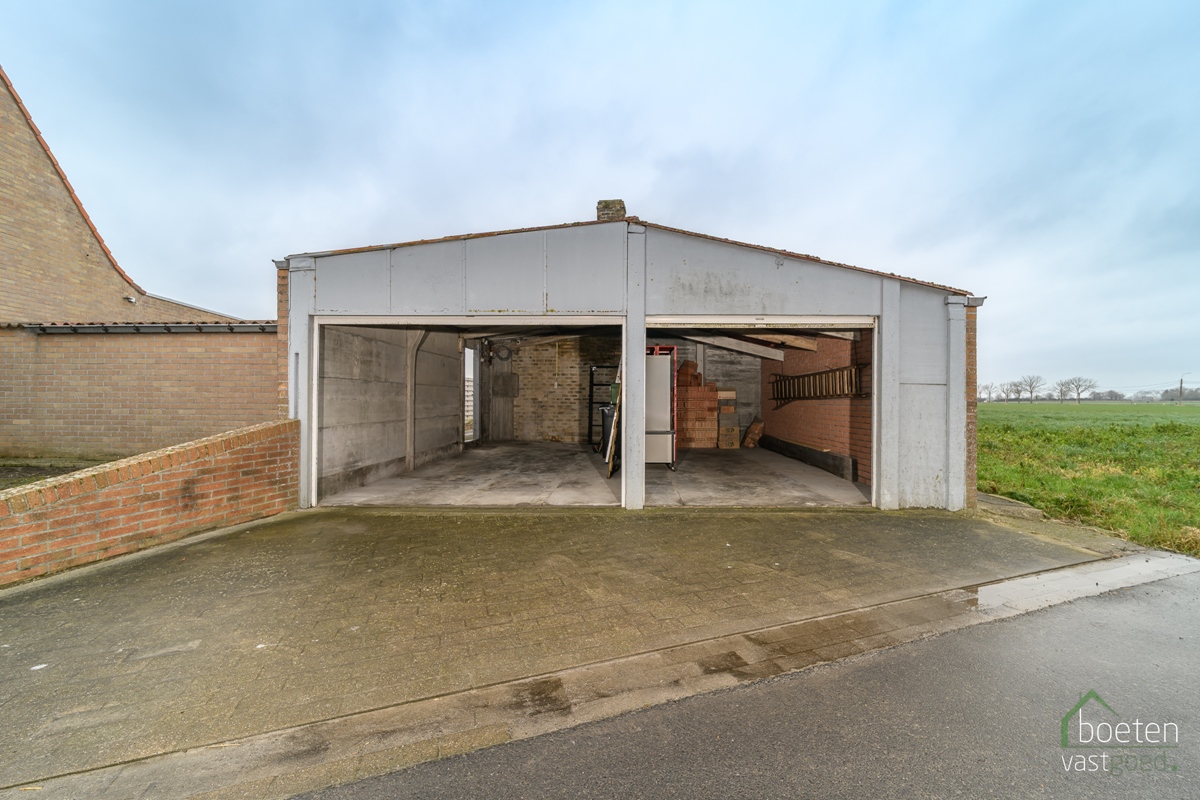 Verder is er nog een dubbele garage met een extra berging. De tuin is volledig omheind. Een deel van de omheining is met opzet niet te hoog zodat de prachtige open zichten rondom rond het eigendom steeds toelaten om te genieten van die landelijke open vergezichten op de Alveringemse velden.