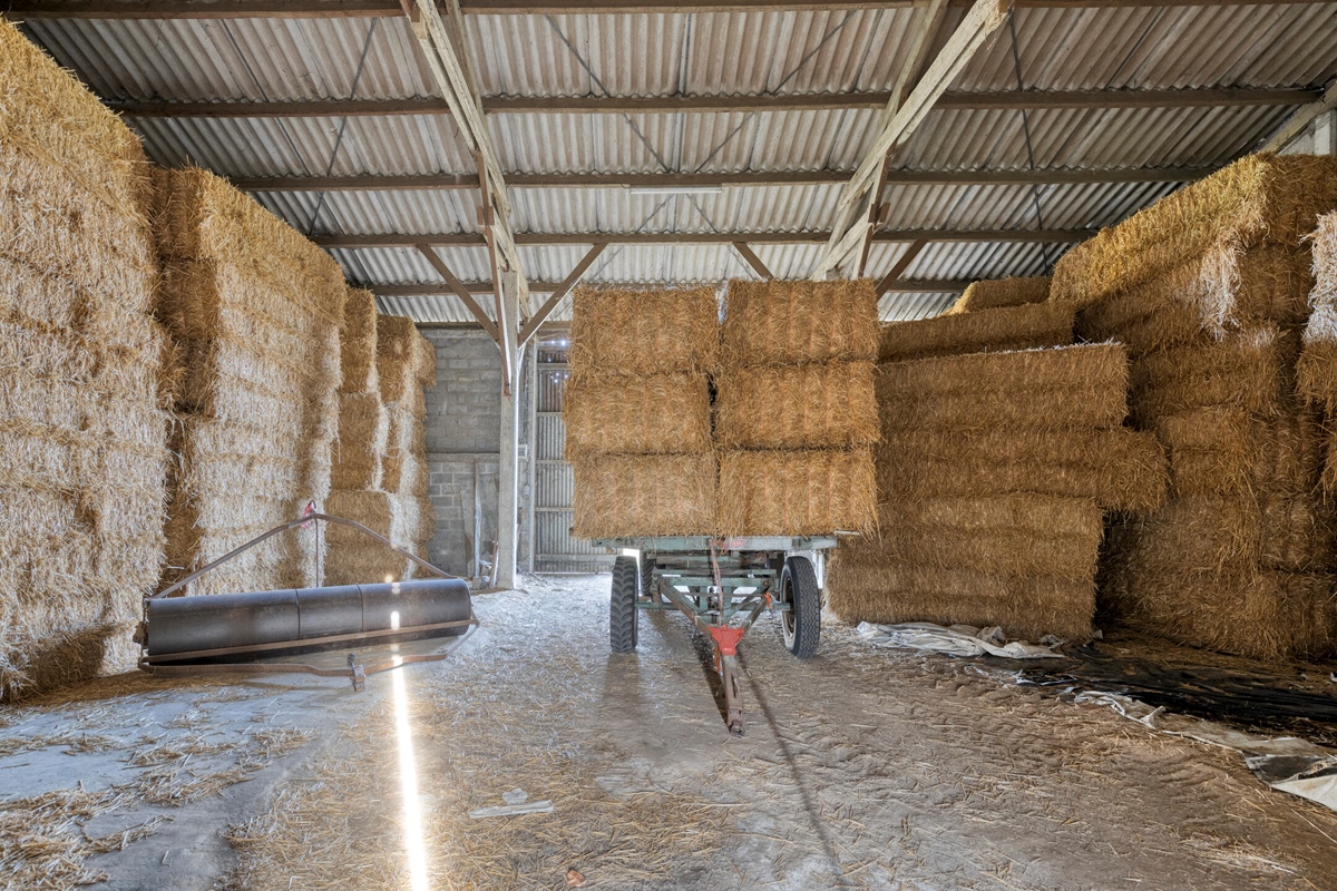 Buiten: Vooraan de woning is er parkeerlegenheid voor meerdere wagens. De 2 stallingen bestaan beiden uit die typische vroegere indelingen met o.a. vroegere paardenstallen, vroegere koestallen, werkkot, wagenkot en ook nog een aparte garageruimte. Eén van de stallingen staat op de Inventaris van Onroerend Erfgoed. Verder biedt de hangaar (ca 185m²) nog een extra opslagruimte. Het eigendom is aangesloten aan een eigen waterzuiveringsinstallatie.