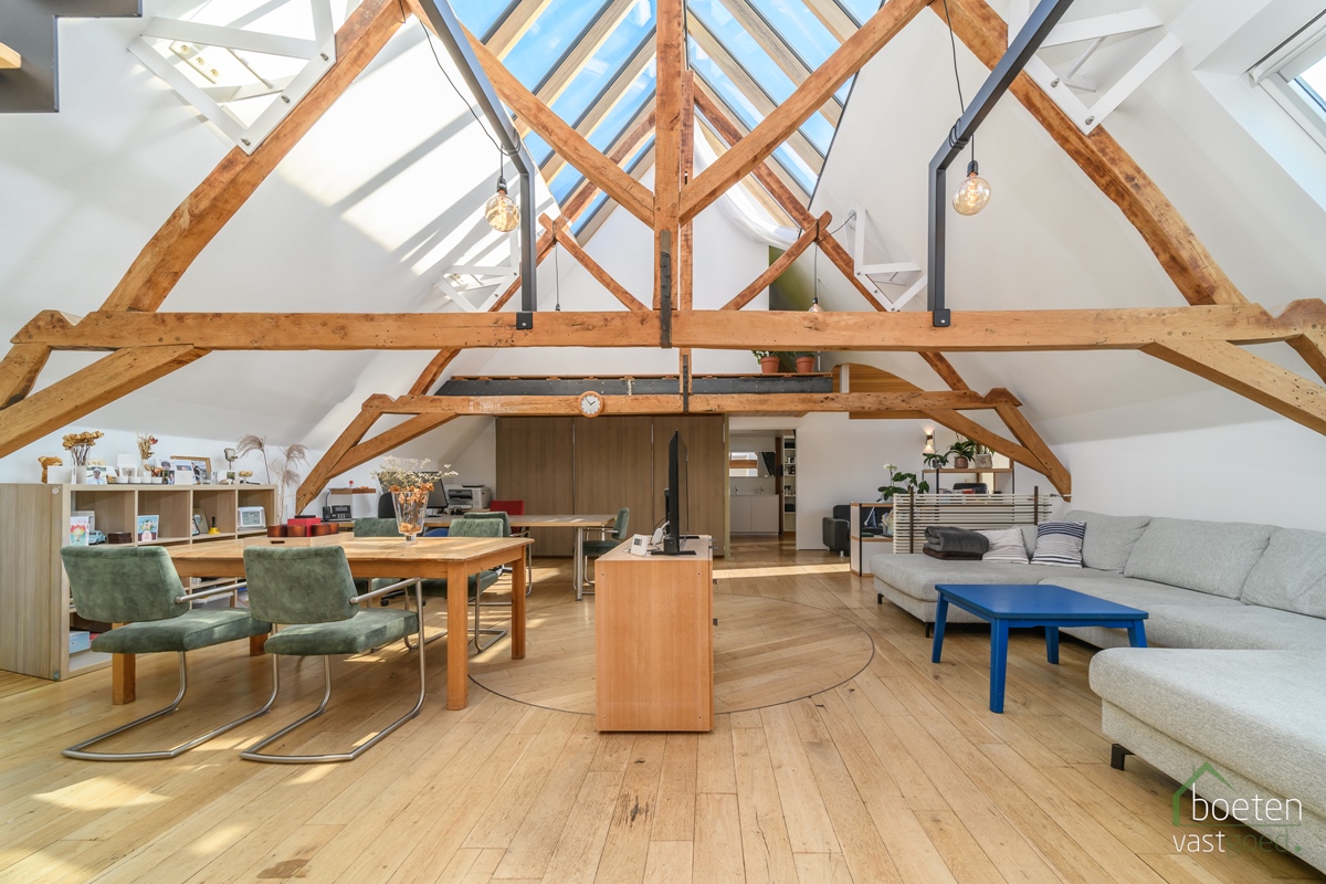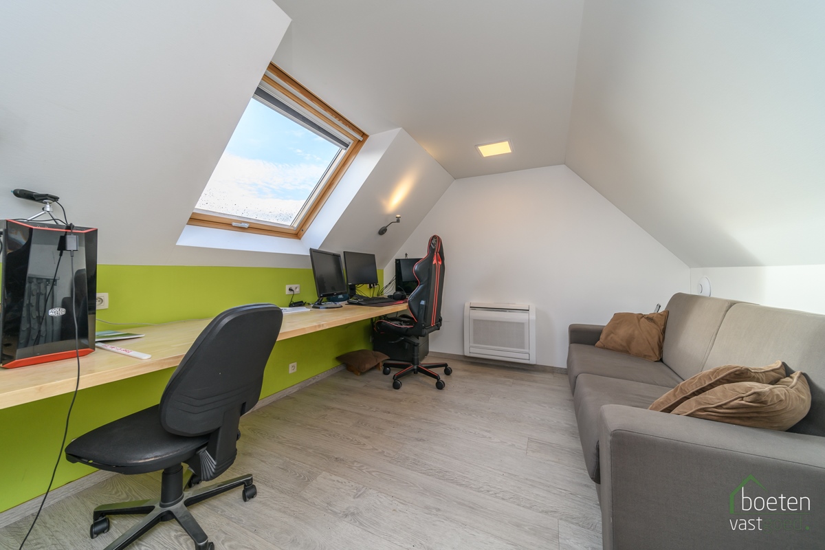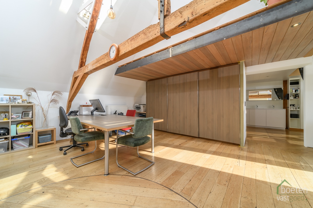 Op het eerste verdiep vinden we een prachtig ingericht woongedeelte die beantwoordt aan de huidige woon- en bouwnormen. Dit resulteerde dan ook in een B-label als EPC voor het ganse eigendom. In totaal is er bijna 200m² bewoonbare oppervlakte. Deze bestaat uit: een magnfieke woonkamer (die niet alleen als zit- en zitplaats kan gebruikt worden maar ook als extra bureauruimte), een volledig ingerichte keuken (2020) met o.a. inductiekookplaat, koelkast, oven, vaatwasser, diepvriezer, afwaseiland,... en héél wat kastruimte, masterbedroom met voorziening eigen badkamer, de eigenlijke badkamer (2018) is volledig ingericht en biedt, naast veel ruimte, een inloopdouche, dubbel wastafelmeubel en toilet. Op de mezzanine zijn er nog 2 jeugdkamers én nog een extra slaapkamer.