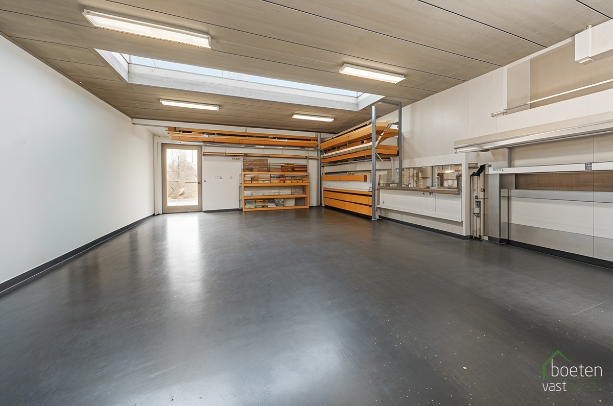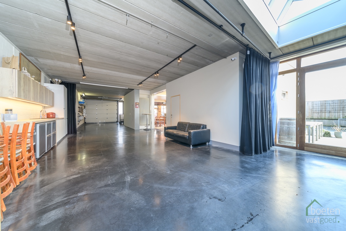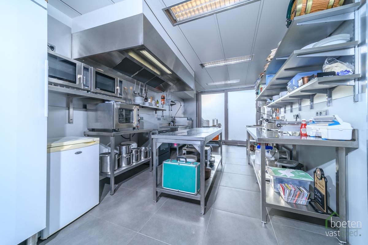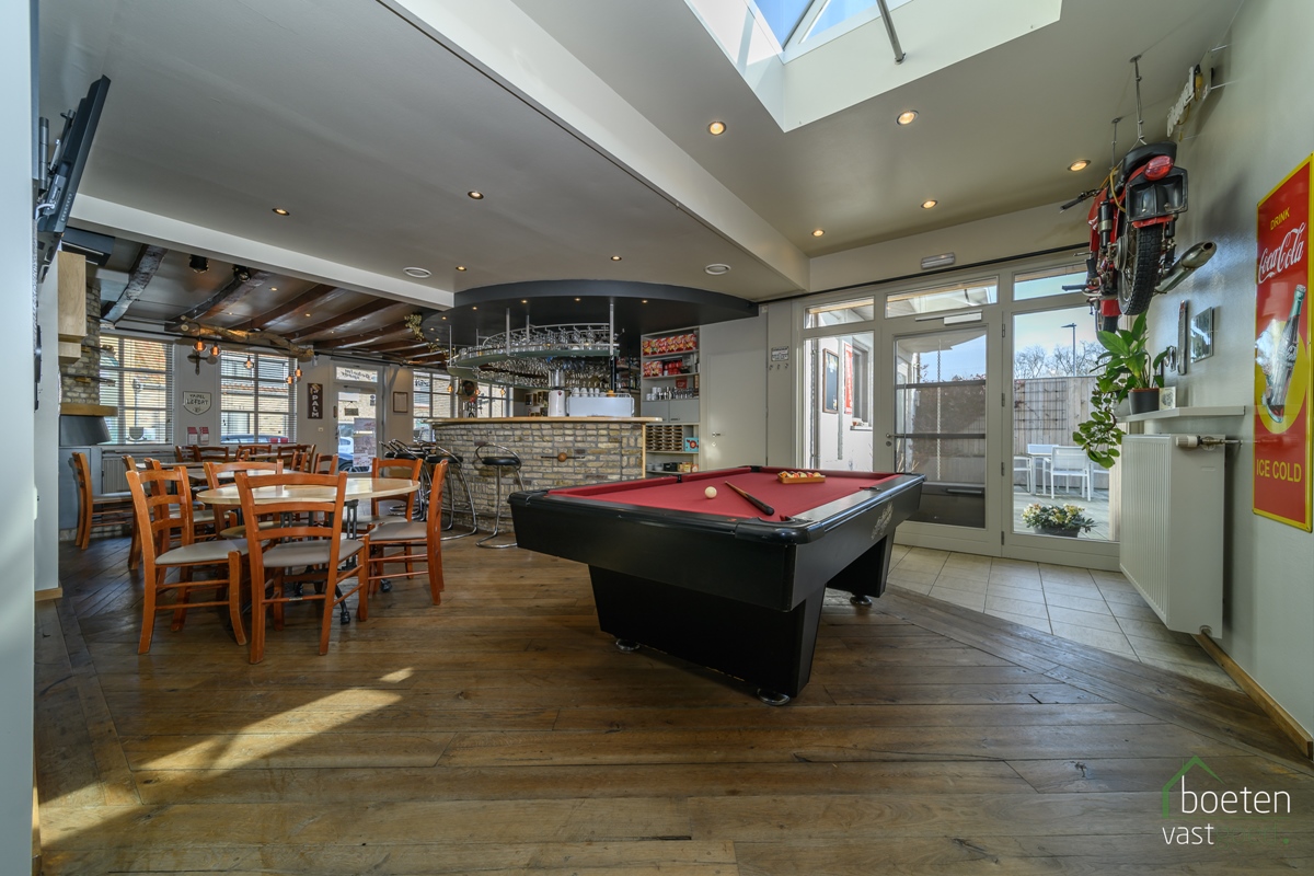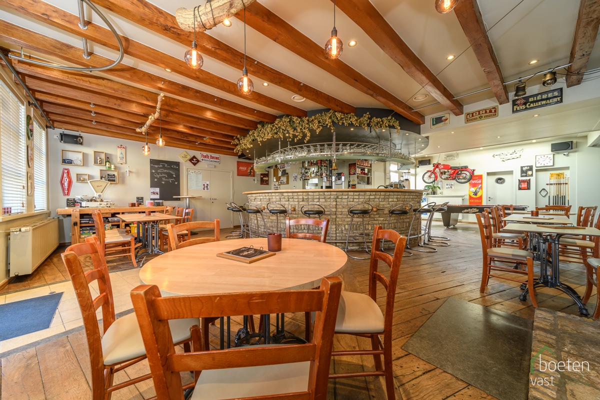 Na enige tijd werd het huisje aanpalend er bij gekocht, dit werd volledig afgebroken en er werd een volledig nieuwe constructie opgebouwd die resulteerde in een mooie verzorgde polyvalente ruimte van meer dan 200m² én extra woonruimte op het eerste verdiep. Als vloer is er gepolierde beton, er staat een handige keukenblok, verwarming voorzien, drijfkracht,... Vanuit deze ruimte is er toegang naar het café, het sanitair én het terras.